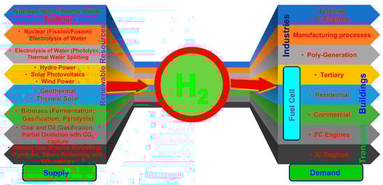 Hydrogen has many favorable attributes, including an overall storage capacity, efficiency, renewability, cleanliness, massive distribution, high conversion, zero emissions, sources, versatility, and quick recovery, making it an excellent choice as an energy supply for heat and power, among many others [15,16,17]. As a result, it is regarded as the most environmentally friendly and promising energy source of the twenty-first century. It is central to industrial applications, such as ammonia production, oil refining, and water–gas switch reactions. Figure 1 illustrates how supply and demand tend to fluctuate; hydrogen is likely to be very flexible, and as a result, the manufacture of hydrogen has received a lot of media coverage worldwide.
