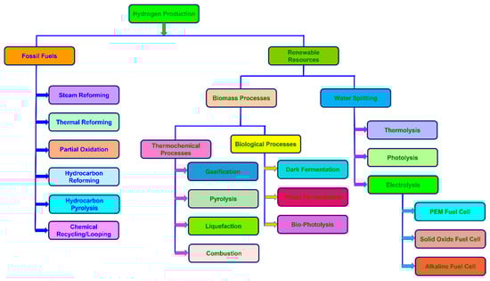 Industrialization in traditional oil upgrading sectors, such as hydro-desulfuration, hydrogenation, and ammonia processing, has recently experienced a dramatic rise in demand for hydrogen. In industrial processing, most liquid-compressed hydrogen gas is commercially prepared using a compression method because of its cost-effectiveness and readily available supplies of hydrogen [18]. However, hydrogen from renewable resources such as lignocellulosic biomass or water separation may also be generated through solar power. Hydrogen from different sources can be obtained in various ways, such as through microorganisms, biofuels, petroleum-based liquids, or the electrolysis of water [19,20]. An illustration of the various hydrogen production methods is shown in Figure 2. Chemical heat reforming is based on the catalysis of methane (typically over 800 C) using steam to generate carbon dioxide and hydrogen [18]. The formed CO then interacts with water vapor to generate H2 and CO2 through the water–gas change reaction. Multiple hydrocarbon-based pathways for hydrogen generation involve improved alkaline renovations, thermal cracking modification, partial oxidation, and steam reforming.