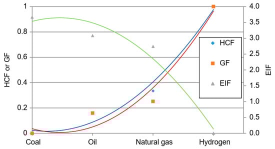 Variety of fuel signifiers that provide information about how fuel affects the environment, and its performance are discussed in impact factors such as Greenization factor (GF), hydrogen content factor (HCF), and environmental impact factor (EIF) of various fuels. The corresponding lines indicate that with increasing hydrogen content (HCF), the energy sources become greener (increasing GF) and the environmental impact (EIF) decreases. (Reprints from [46]. Copyright (2022), with permission).