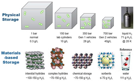 Considerable safety precautions are required for preserving hydrogen in a liquefied condition at high pressures of over 100 MPa and cryogenic temperatures of around −253 °C. Many researchers are interested in innovative hydrogen storage materials, such as carbon nanostructures, metal, and complex hydrides that have recently been discovered [50]. High pressure or significantly lower cryogenic temperatures are not required for hydrogen storage in a solid form, making it a safer and more cost-effective method of hydrogen storage. Deploying hydrogen commercially in industry necessitates efficient packaging, storage, and transportation. The material for H2 storage shown in Figure 5 requires further investigation to guarantee that it is safe, trustworthy, and affordable [51,52]. The concept of hydrogen storage is recognized as challenging. The materials employed must not actively interact with hydrogen or any other process. In addition, traditional storage methodologies using high-pressure gas cylinders (compressed hydrogen) and liquid hydrogen; the physical adsorption of H2 on materials with significant variables, such as a large specific surface area; and hydrogen intercalation in metals and complex hydrides resulting in the storage of H2 in metals have been thoroughly examined [53,54,55,56].