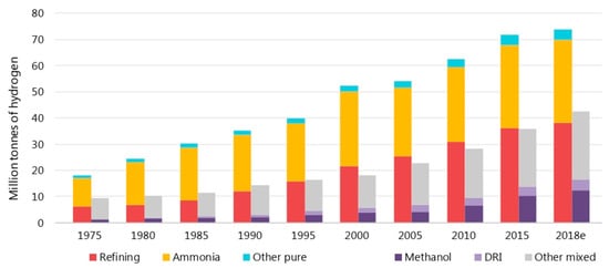 The yearly increase in the global demand for hydrogen since 1975 (Reprints from [43]. Copyright (2022), with permission).