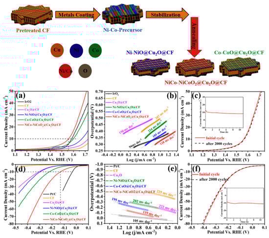 Various materials have been explored with the ability to replace conventional noble metal catalysts, including non-precious metals, metal oxides, carbon nanotubes, metal–organic frameworks (MOFs), and even single-atom catalysts [76]. Song et al. synthesized an efficient bifunctional electrocatalyst of Ni-Co mixed-metal oxides incorporated with cobalt/nitrogen-doped carbon with a hierarchical hollow nanostructure (H-Co/N–C@NiCo2O). Their catalyst demonstrates an excellent electrocatalytic activity and long-term stability for both the ORR and the OER of rechargeable Zn–air batteries [77]. With a high starting potential and large limiting current density, Xiao et al. synthesized a 3D highly ordered mesoporous MnO2@Ni-pc nanocomposite that considerably improves the ORR performance of MnO2, while maintaining a low cost [78]. According to Xu et al., a generic technique for manufacturing bi-metal Ni and Fe single-atom catalysts loaded on graphene to increase the activity of the OER was developed [79]. More recently, Qazi et al. successfully employed surface-modified copper foam along with NiCo–NiCoO2 nano-heterostructures for a superior bifunctional electrode material. Figure 7 illustrates the preparation process and its performance. Bimetallic thin-layered nano-heterostructures of NiCo–NiCoO2@Cu2O@CF show a synergic effect of doubly active metals Ni and Co to accomplish impressive small overpotentials of 133 and 327 mV to gain a current density of 10 mA cm−2 for HER and OER [36].