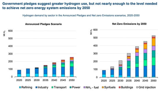 Simultaneously, awareness of global warming has increased, governments and businesses have made firm promises to decrease CO2 emissions. Despite the fact that this has accelerated the deployment of hydrogen for modern innovations, there is still a lack of demand in this field. Yearly hydrogen consumption in transportation, for example, is less than 20 kt H2 for about 0.02 percent of overall hydrogen demand. According to the IEA’s Net Zero by 2050 framework, meeting government decarbonization targets would necessitate a significant acceleration in hydrogen technology deployment throughout various energy industry sectors. Enhancing hydrogen as an alternative energy component is a long-term project since emerging fuels might take several years to fully integrate into the energy supply. As a result, immediate intervention is necessary to speed up the scaling-up operation and establish the circumstances essential to make sure that, by 2030, hydrogen technologies can be broadly adopted and employed in a long-term strategy for a low-carbon economy [116].