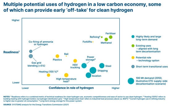 There are four kinds of possible hydrogen usages in a zero-carbon economy, as illustrated in Figure 11 [121]: