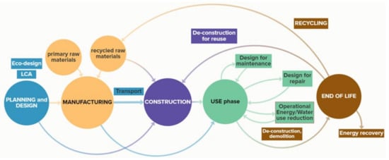 At the building level, different actions are being carried out to move towards a production and consumption model where waste is reduced as much as possible. The main circular strategies applicable to the building general framework are depicted in Figure 1.