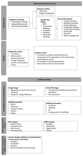 This review paper is divided into two major parts. The first part describes the methodology followed to conduct the literature review. The second part presents a comprehensive summary of what was carried out and found about circular economy strategies in building construction and the analysis of the building renovation market, as well as the current state of the art for the analysis of its circularity. In addition, a discussion section is provided with the aim to remark, describe, analyse, and interpret the main findings. Finally, a conclusion section including a proposal for future research work is presented.