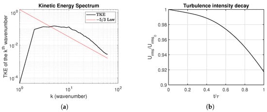 The initial turbulence was generated by convoluting a random stream function with a filter. The gradient of the resulting field produces the velocity field. This way, the turbulence is homogenous, isotropic and divergence-free, the latter by definition. The spectra of such an initial field after it has decayed is plotted in Figure 1a. Although the initial turbulence does not follow the −5/3 law, as it decays, the spectra relaxes to the −5/3 law.