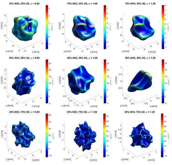 - Netzer, C.; Ahmed, A.; Gruber, A.; Løvås, T. Curvature effects on NO formation in wrinkled laminar ammonia/hydrogen/nitrogen-air premixed flames. Combust. Flame 2021, 232, 111520. [Google Scholar] [CrossRef]