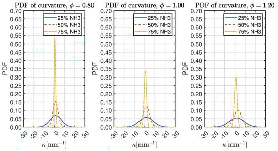 The curvature can be studied quantitatively using the probability distributions shown in Figure 3. The PDF was computed by fitting a normal distribution function over the curvature values on the flame surface.