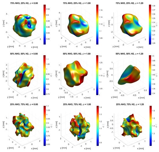 Here, the positively curved regions are convex towards the reactants, and the negatively curved regions are concave towards the reactants. For a constant mixture ratio, as the equivalence ratio is increased, the flame starts to wrinkle with highly strained leading edges. As for a constant equivalence ratio, as the percentage of hydrogen is increased, a larger number of wrinkles with larger curvature values is observed. It is also observed that the case with 50% ammonia with an equivalence ratio of 1.2 is different from the other cases, but this is just a consequence of the randomness of the turbulence initialization.