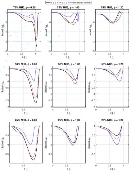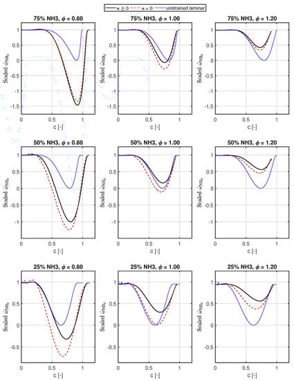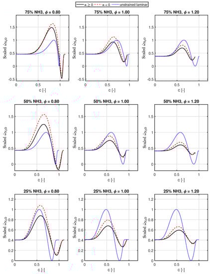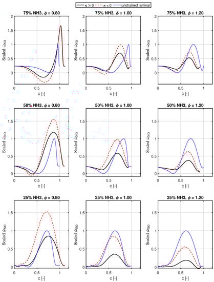 In Figure 7, the source terms of ammonia have been plotted, similar to Figure 5. We see that compared to the hydrogen source term, the deviation from the 1D unstrained laminar flame for NH3 source term is lower, as expected, since the diffusive mobility for NH3 is lesser compared to H2.