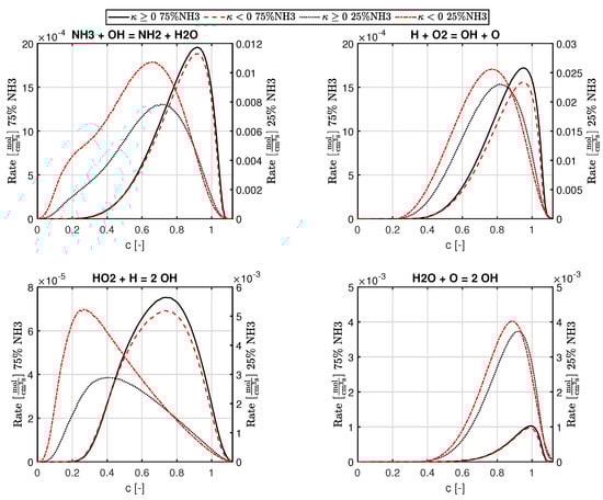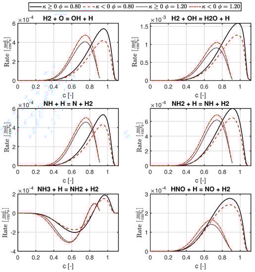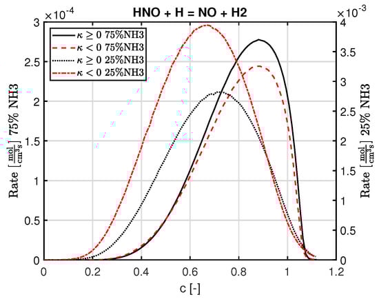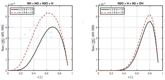 Equations (4) and (5) are OH production reactions which involve H radicals and are enhancedfor positive curvature for the highest amount of ammonia, while the opposite is observed when the amount of ammonia is reduced. Although we know that hydrogen radicals are focused at the flame front with negative curvature values [16], the contradictory behaviour observed for the most amount of ammonia could be due to the fact that the H radical pool in the cases with the most ammonia is sufficiently low such that it is consumed before any diffusion processes enable focussing of the radical in the negatively curved flame front. Since the H radical is produced more in the flame fronts with positive curvature, due to the increase in the local equivalence ratio, the OH-producing reactions involving H radicals are higher for a positive curvature. As the amount of ammonia is decreased, the H radical pool gets larger, and there is sufficient time for the diffusion process to focus H in the flame front with negative curvature, hence increasing the reaction rates of OH-producing reactions. This means that the NH3-consuming reactions increase for negative curvatures as the amount of ammonia is reduced. This also hints at a critical amount of hydrogen in the fuel mixture at which the signs of the curvature affect the concentration of H radicals. This has effects on NO reactions as well, which is discussed further. The final OH-producing reaction, Equation (6), involves H2O, which will have higher concentrations for positive curvatures due to a higher equivalence ratio, hence enhancing the reaction.