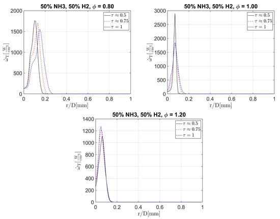 The effects of preferential diffusion and turbulence on the flame also affect the heat release and temperature. By looking at time evolutions of these, the effects of the variations in flame chemistry observed in the previous section on the flame can be studied. In Figure 13, the conditional mean of the heat release at different non-dimensional values of r, the radius from the centre, has been plotted for 0.5, 0.75 and 1 eddy turn over time for a 50% ammonia and 50% hydrogen case.