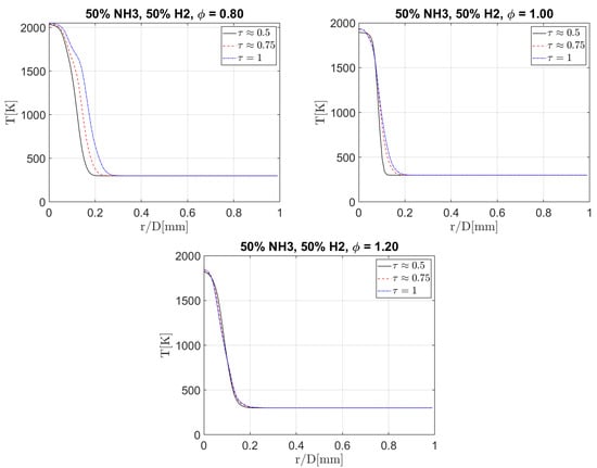 The turbulence decay behaviour has been detailed in [22,23]. The integral length scale can be selected by choosing a particular filter width. The chemistry was initialized by converting a 1D flame, generated using CHEM1D [24], into a 3D flame kernel. It is also of note that by superimposing the laminar initial condition, the velocity field loses its divergence-free character. The cases studied in this paper are detailed in Table 1, where is the equivalence ratio, is the laminar inner layer temperature, is the laminar flame speed, is the turbulent RMS velocity, is the integral length scale, is the laminar flame thickness, Re is the Reynolds Number, is the Kolomogorov length scale and is the eddy turnover time. Re is computed as , and is computed as giving the ratio computed as , where is the Karlovitz number. The cases were selected to compare three equivalence ratios of 0.8, 1 and 1.2 and three ammonia composition percentages of 25%, 50% and 75% in air at constant of 10 at atmospheric pressure. These test points fall in the thin reaction zone. Since we used a constant and , all cases can be represented by a single point on the Peters–Borghi regime diagram [25], and the instantaneous turbulent velocity field is different for each case. Diffusion is modelled using the constant Lewis approach, where the Lewis numbers are obtained from a 1D adiabatic flame solution computed using CHEM1D, an in-house 1D code [24], with a multi-component diffusion model including thermal diffusion which is implemented in the code using the EGLIB fortran library from Ern and Giovangigli [26]. The UC San Diego [17] mechanism was used for this study due to its sufficient accuracy combined with its short number of reactions and species. Although several other mechanisms for ammonia combustion exist [27,28,29,30,31,32,33], these have large numbers of reactions and species, restricting their use in DNS studies and hence were not considered for use in this study.