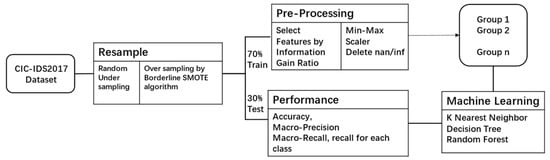 The algorithm proposed in this paper is based on the CIC-IDS 2017 dataset. Firstly, the Border Line SMOTE algorithm is used to balance the dataset, and then the information gain ratio is used for feature selection to obtain a suitable dataset. Section 3 is the preliminary part, Section 3.1 introduces the dataset, and Section 3.2 introduces the Border Line SMOTE algorithm, which is mainly used for balancing datasets. Section 3.3 introduces the information gain ratio; the calculation of the information gain ratio involves entropy and information gain. Section 3.4 introduces the evaluation metrics of the algorithm.