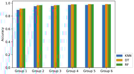 Figure 2 is the schematic diagram of the overall accuracy of the three algorithms in the six groups. It can be seen that the results of Group 4, Group 5 and Group 6 are basically the same; that is, when the number of features is more than 62, adding features has no effect on the overall accuracy. The main contribution of this paper is to propose an algorithmic framework based on feature selection and data balance, rather than the final machine learning algorithm. From the results, it can be seen that when selecting suitable features, choosing different machine learning algorithms has little effect on the results, such as Group 6 in Figure 2. Even a not-so-advanced machine learning algorithm such as decision tree has a final accuracy rate of over 99%; thus, the algorithm in this paper has application value compared to the state of the art.