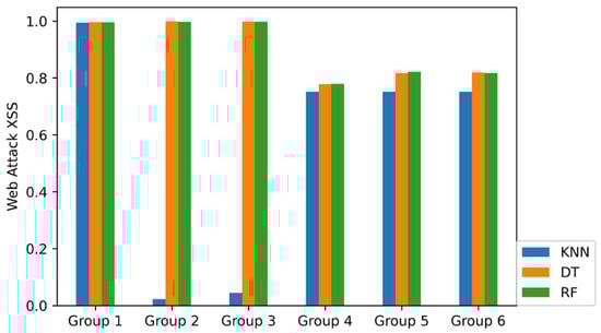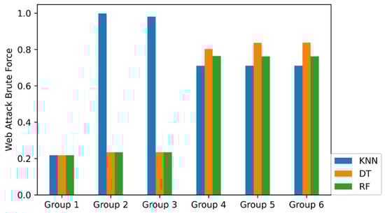 Figure 3 and Figure 4 show recall rates of Web Attack Brute Force and Web Attack XSS under different algorithms and feature selection. Web Attack Brute Force chose the KNN algorithm in Group 2 with the highest recall rate. The recall rate of Web Attack XSS decreases with the increase in features.