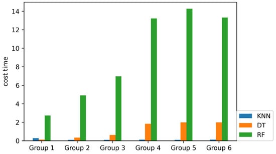 Figure 5 shows the training time of the three algorithms. It can be seen that as an ensemble-learning algorithm, the training time of random forest is much longer than that of the decision tree and K-nearest neighbor algorithms. There is little difference in the training time between KNN and DT when the number of data features is low. When the data features increase, the training time of decision tree is also much longer than that of KNN. The difference in training time is determined by the algorithm. Both KNN and DT are single models, while RF is an ensemble algorithm composed of multiple RTs; thus, the training time is more. More specifically, the time to train the model is related to the time complexity of the algorithm. The reason that the times of the KNN and DT algorithms are similar is because the time complexity of KNN is , i.e., O(n2), and the time complexity of DT algorithm is , that is O(n3logn). When the number of features increases from less, its effect on the increase in time is reduced, and the sampling number of the two algorithms is unchanged in this process; thus, the time difference between the two algorithms is mainly determined by the number of features; thus, the time of the two algorithms is similar.