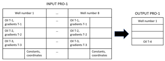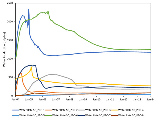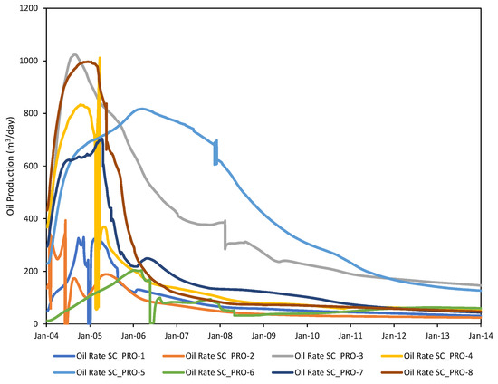 The forecasting models were developed using a dataset comprising production data from eight wells (PRO-1 to PRO-8). A total of 3653 observations were recorded over 10 years, from January 2004 to December 2013. The dataset was generated from numerical simulation results with the PUNQ-S3 model. It was assumed as raw or actual data from field measurements for constructing the data-driven models. The field dataset was assumed to be composed of daily records of the time series data of a well. Generally, the time intervals between data points may be diverse. The time series data included oil production (m3/day), water production (m3/day), and gas production (CO2-kg/day) (Figure 3, Figure 4 and Figure 5). These data were measured using multiphase flow meters at the producing wells in the field.