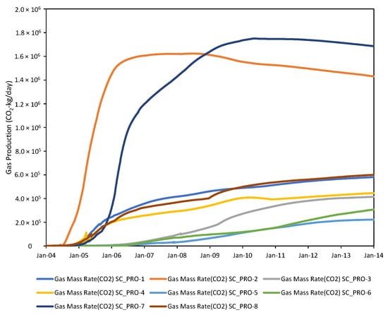 The well configurations implemented on PUNSQ-S3 are shown in Figure 2. Each of the eight producing wells (PRO-1 to PRO-8) was placed with permeability distributions on each layer as guidance. Consequently, each well has several components in the productive layers (Table 2) so that they may contribute to oil production. Additionally, two CO2 injection wells (INJ-1 and INJ-2) were positioned in the northern and southern parts of the reservoir to sweep the remaining residual oil.