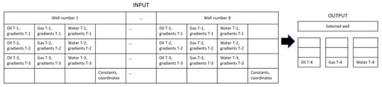 This notion was formulated as a multivariate time series forecasting problem in which the architecture of the data-driven model is sequence-to-vector (Seq2Vector). Two different data-driven models were tested: global and reduced feature models. The global model was trained on a dataset composed of measurements from multiple wells by considering the 3-phase flow (oil, water, and gas). Similarly, the reduced feature model was trained on the dataset composed of measurements from multiple wells but with one phase at a time. The input and output with three old observations (N_old_obs = 3) for the global and reduced feature models are shown in Figure 7 and Figure 8, respectively.