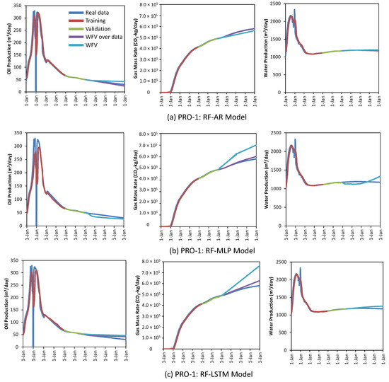 As illustrated by the purple line, the WFV over data predictions (one time step) for the AR model followed the actual data trend until the end of the project for the entire time series. A similar prediction trend was only observed for gas production for the MLP and LSTM models. For every time series, the LSTM model retained the prediction trends for only a certain number of time steps, but the MLP exhibited a significant premature deviation from the actual data.