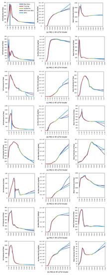Likewise, MLP models for both WFV over data and WFV predictions have varying forecasting horizons. The low standard deviation indicates that the LSTM models have a consistent forecasting horizon across different wells and datasets. This implies that LSTM models have a high degree of generalizability and are robust at capturing multivariate relationships across various datasets. Figure 14 depicts the entirety of LSTM models with reduced features for all wells and datasets. It can be observed that the WFV over prediction in most time series resulted in a longer forecasting horizon than the global models. Although there are some prediction errors in a few wells, the model can generally represent the multivariate relationship between reservoir parameters and production data. In particular, reproduction of the oil and water patterns showed substantial improvements. Likewise, the WFV predictions perform better in most wells and time series. The forecasting horizon is extended, and sudden jumps in the prediction are reduced significantly. Overall, the non-linear approximation holds for short-term forecasts, but the deviation is more pronounced when the forecasting horizon becomes large.