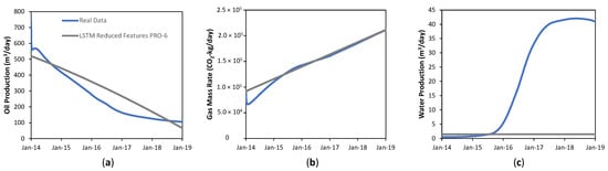 From Figure 15, it is evident that the LSTM reduced feature model using PRO-6 well can mostly reproduce the trend of real datasets. The model tends to slightly underestimate oil production, while it overestimates gas production in the first year and then closely follows the upward trend. The profile of water production cannot be perfectly replicated for all years, especially for the oscillating part. However, it matched the plateau trend for the first two years. The forecasting results can be improved if daily water production records are available for a short time. Using this data, the model is expected to reproduce the curvature of the water production more accurately. Overall, the LSTM reduced feature model PRO-6 is in good agreement with the real dataset of the infill well.