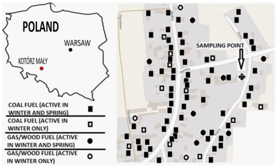 The sampling point was situated in the dense building area and close to the district road in the old part of the village. As previously mentioned, the study area was characterised by storey rural houses, which predominantly used obsolete individual heating systems (IHS). Coal was mainly used throughout Kotórz Mały in a proportionate share equal to 81% (Table 1). All IHS are usually used during the cold season (form October until April). In the summer, local peoples also use IHS for hot water supply and food preparation, but the number of IHS in use is significantly lower. In the neighbourhood of the sampling point during the measurement campaigns, 86 individual point emitters (IPE) from 97 IHS were active in the winter and 71 in the spring. The location of IPE is shown in Figure 1. The exact number of specific emission sources was determined based on the results of surveys conducted among the residents. The activity of emission sources was indicated on the basis of individual responses of IHS owners and the authors’ own observations. The activity of emitters was periodic and dependent on the needs of users. The average daily time of IPE activity was 17 h in the winter and 14 h in the spring.