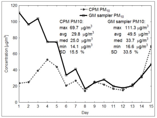 Figure 2 shows the distribution of PM10 mass concentrations determined using both methods. The average concentration of PM10 for the whole measurement period in January–February was 34 and 44.3 µg/m3 for CPM and GM, respectively. It was below the daily PM10 limit value determined by the European Commission (50 µg/m3) [], which must not be exceeded for more than 35 days a year. Days which exceeded the daily limit value were also observed, that is, days 1–6, 9, 10, 12, 20, 21 and 1–6, 9–15 19–21 in the CPM and GM measurements, respectively. Despite the observed fluctuations, it can be concluded that the PM10 concentrations measured with CPM and GM were similar only during the winter period. The coefficient of variation was at a similar level, that is, 51% for CPM and 65% for GM.