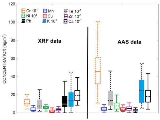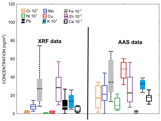 Figure 4 shows the full measurement data for PM10-bound elements for the winter period. The mean concentrations of selected elements associated with PM10 ranged widely, with values from 0.61 ng/m3 (Ni) to 219 ng/m3 (Ca) for EDXRF and 1.46 ng/m3 (Ni) to 250 ng/m3 (Ca) for AAS. The masses of the nine elements represented almost 1.6% of the total PM10 mass for EDXRF and 2.0% for AAS. For both techniques, Ca, K and Fe were the most abundant among the determining elements. Toxic trace elements were present in very low concentrations (Ni, Cr, Mn) not exceeding 10 ng/m3 (mean daily value) or low (Pb). The mean concentrations of Ni and Pb in Kotórz Mały did not exceed the permissible values of annual concentrations established by the European Commission (20 ng/m3 and 0.5 µg/m3, respectively; []). When considering the position of the median, it may appear that for both methods, the concentrations of Mn, Ni, Zn and Ca can be taken as equivalent. On average over the whole measurement period, the elements associated with the PM10 particulate matter under observation for EDXRF can be ranked as follows: Ca > K > Fe > Zn > Pb > Mn > Cu > Cr > Ni, while for AAS, the order was almost identical: K > Ca > Fe > Zn > Mn > Cu > Cr > Pb > Ni. In the case of EDXRF, two groups of elements can be distinguished because they were characterised by similar coefficients of variation (CV); CV ranging from 52% to 70% (Zn, Cr, Ca, Mn) and CV ranging from 70% to 88% (Pb, K, Fe). Two extreme CVs were also recorded: 39% and 115% for Ni and Cu, respectively. There was much more variability in the elements determined by the AAS method. With the exception of Cr in which the CV was 47%, the concentrations of the other elements showed a significant quartile range, with CVs for Ca, K, Pb, Zn, Cu, Mn, Fe and Ni ranging from 104% to 167%. Significant discrepancies were observed between the results of the two techniques, particularly in the mass concentration of Cr (more than 4 times the median value for AAS) and Cu (more than 3 times the median value for AAS).