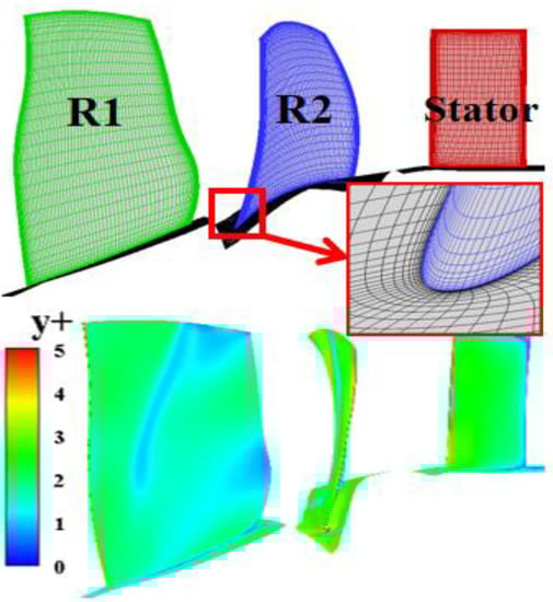 In addition, the central difference scheme is used for spatial discretization, and the explicit Runge–Kutta method is used for time discretization. The implicit residual smoothing method and multi-grid technology are used to accelerate simulation convergence [29]. The revolutions of the R1 and R2 blades are 18,390 and 14,400 respectively. At the inlet, the intake direction is axial, the total temperature is 288.15 K and the total pressure is 101,325 Pa. The outlet boundary condition of the static pressure at the middle diameter is given, the static pressure value at the design point is 274 kPa, and the pressure at other radial positions of outlet is determined by the simple radial equation. In the simulation, the air-mass flow rate into the counter-compressor is changed by adjusting the back pressure at the outlet. No-slip and adiabatic wall conditions are used for all the wall boundaries.