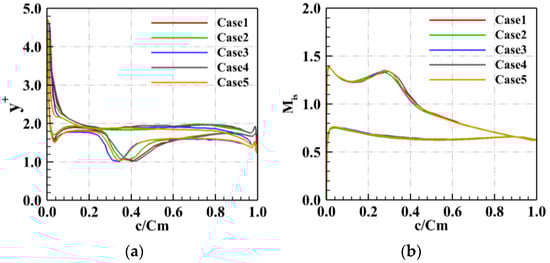The grid division is completed in a NUMECA/AutoGrid5 module; the O4H grid topology is selected. In order to accurately solve the internal flow of the boundary layer, the surface of the blade profile adopts the structured grid, and the height of the first layer of the grid is 0.005 mm. Due to the complex shock wave problem in the high-Mach-number compressor channel, the degree to which the number of grids affects the simulation results must be investigated. The results of the global parameter grid independence tests are shown in Table 2. When the grid number exceeds 2.4 million, the relative changes between the mass flow rate, total pressure ratio, and adiabatic efficiency are all less than 0.1% at the design point, and the simulation results tend to be stable. At this time, the y+ of near the blade surface is less than 5, which shows that the grid distribution can accurately simulate the aerodynamic performance of the actual compressor. The grid and y+ on the blade surfaces are shown in Figure 1. In addition, Figure 2 gives the local parameter grid independent verification of the 50% span section of the R1 blade, such as y+, isentropic Mach number, and the results show that under different grid numbers, its value changes relatively little. Therefore, this paper determines that the numerical simulation results are independent of the number of grids. Considering the computational cost, the case 4 grid parameter setting is adopted in all subsequent examples in this paper.
