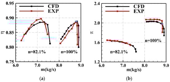 Comparison of aerodynamic parameters at the Section 2. (a) Adiabatic efficiency; (b) Total pressure ratio.