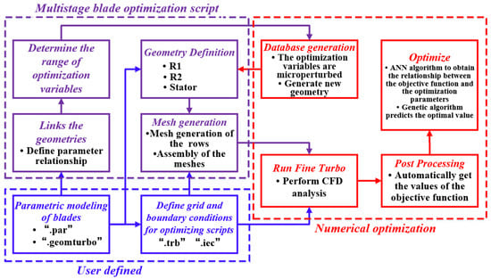 The three-dimensional blade channel aerodynamic optimization design platform developed in this paper uses the numerical optimization method based on an artificial neural network and genetic algorithm, and it is finally integrated on the NUMECA/Design3D module by coupling CFD technology and a self-edited Python script. The logical relationship is shown in Figure 4. Among them, the user defined module can complete the functions of blade parametric modeling, grid division, physical model selection, and boundary condition setting. The Python script in the multistage blade optimization script module is the highlight of the highly automated platform, which first determines the blade geometric parameters that need to be modified and defines the geometric parameters as optimization variables that the platform can recognize, and then completes the link of the geometry functions. Second, the method determines the range of optimization variables which are used to limit the parameter search space of the optimization algorithm, and then interacts with the user defined module and the numerical optimization module to complete the work of generating geometric files, performing grid generation, and assembly of the meshes. The resulting grid is invoked by the solver of the numerical optimization module, and the objective function is automatically obtained. For the effective samples generated by the numerical optimization module, artificial neural networks can be used to find the relationship between the objective function and the optimization variables, and then the optimal value of the objective function can be found through the genetic algorithm to obtain the optimal blade geometry.