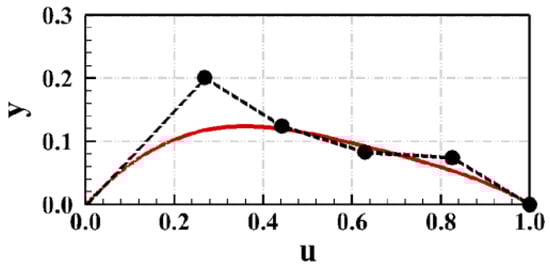 The parameterization of the camber line is shown in Figure 5. To keep the leading-edge position of profile unchanged, the camber line is fitted with a high-order Bezier curve controlled by five discrete points, which can ensure a smooth blade profile and avoid large aerodynamic loss. Each blade has five parametric cross-sections equidistantly distributed along the spanwise direction. They are represented by the red dotted line in Figure 6. The specific optimization method is to add a perturbation amount to each discrete point of the camber line of the R1 and R2 blade designated sections, respectively, and optimize the three-dimensional blade channel geometry by controlling the shape of the camber line.