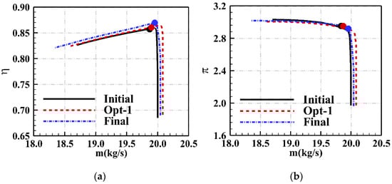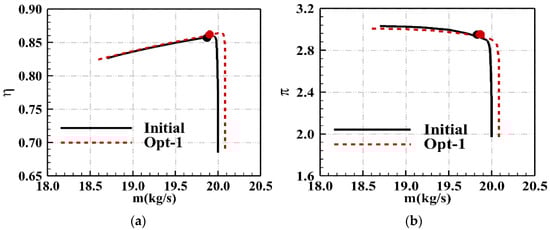 Figure 7 shows the comparison of aerodynamic performance characteristic lines for the initial case and opt-1 case. After optimization, the aerodynamic performance of the compressor has been improved in different degrees at the design point and off-design point. The blade’s ability to organize airflow in the stage environment has been enhanced, which is mainly manifested in that the mass flow rate at the design point increases by 0.15%, the choking flow rate increases by 1.704%, and the stall flow rate decreases by 0.64%, which means that the stable working range is significantly increased. When the total pressure ratio at the design point remains unchanged, the adiabatic efficiency varies from 85.71% to 86.07%, increasing by 0.36%. The above performance-expansion data prove that the aerodynamic optimization work of the R1 blade channel is positive.