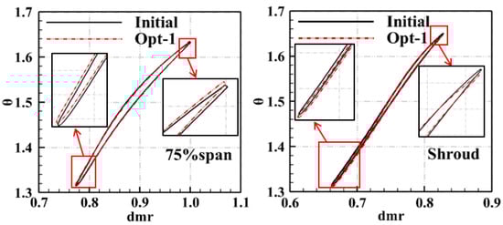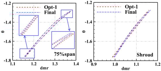 Figure 16 also shows the blade profiles with large geometric changes before and after the R2 blade optimization. After optimization, both at the 75% span and shroud section, the pre-compression blade profiles are formed at the front part and the airflow is compressed through the concave section of the front part, which can reduce the Mach number before the shock wave and achieve the purpose of controlling shock wave structure. At the shroud section, the turning angle of the blade profile is increased, making full use of the large airflow velocity in the supersonic blade tip area, and the blade’s ability to work on airflow is enhanced, which improves the aerodynamic load in this area. Figure 17 shows the variation law of aerodynamic performance at Section 2 (as shown in Figure 6) along the spanwise direction. After optimization, the average adiabatic efficiency of Section 2 is increased by 1.34% and 0.89% compared with the initial case and opt-1 case, respectively, and the total pressure ratios of Section 2 both increases by 0.03%.