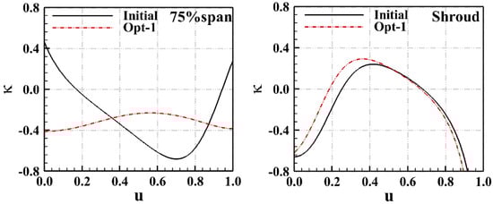 Figure 9 shows the change of camber curvature before and after optimization, which can more intuitively analyze the control effect of the blade profile geometry on the shock wave structure in the channel and boundary layer separation in the near-wall region. At the 75% span section, the camber of the optimized blade profile has a negative curvature globally, and the curvature distribution is significantly slower than the initial case, which is beneficial in reducing the adverse pressure gradient in the channel. At the shroud section, taking the position of 20% chord length as the boundary, the camber curvature of the blade profile’s front part is reduced, and the large pitch angle of the inlet is alleviated, which improves the flow matching characteristics in the blade channel.