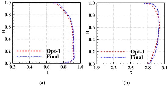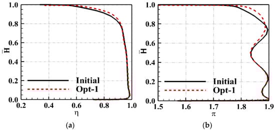 Comparison of aerodynamic parameters at Section 1. (a) Adiabatic efficiency; (b) Total pressure ratio.