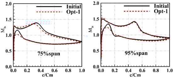 The aerodynamic performance of the counter-rotating compressor under high Mach number is very sensitive to changes in blade geometry. Among them, the comparison before and after optimization of the blade profiles with relatively large geometric changes is shown in Figure 8. At the 75% span section, the front part of the optimized blade profile produces a rapid turn that is similar to a slope, forming a pre-compressed profile, which has been widely used in the design of turbomachinery. The camber of the slope segment has the characteristic of negative curvature, which is also shown in Figure 9. The main function of this type of profile is to reduce the Mach number before the shock wave and to reduce the interference between the shock wave and boundary layer. This conclusion has been recognized by many scholars [31,32]. The straight rear part can reduce wake area size. At the shroud section, the turning angle of the optimized profile’s front part is reduced, and the expansion in the channel is suppressed, which can also reduce the shock wave intensity.