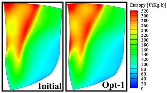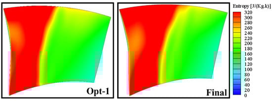 The change of the channel geometry will inevitably affect the distribution law of the thermodynamic parameters on the blade surface. Figure 13 shows the distribution cloud map of entropy on the R1 blade suction. The upper-half part of the blade forms a shock wave due to supersonic airflow, resulting in a high-entropy region. However, the traditional flow-field diagnosis method based on the entropy distribution of the blade surface has certain limitations in analyzing the shock wave and the secondary flow of the channel. Only the entropy cloud map can roughly indicate the position of the shock wave but cannot intuitively indicate the structure and influence range of the shock wave, and it is difficult to compare the changes of the entropy distribution on the blade surface before and after optimization.