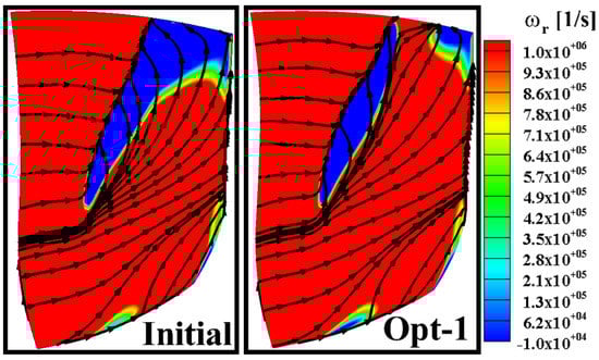 Figure 14 shows the distribution cloud map of the radial vorticity and skin-friction vector lines on the R1 blade suction surface. The radial vorticity determination method of vortex dynamics diagnosis provides a new perspective for the aerodynamic optimization design of three-dimensional blade channels and flow-field diagnosis of the compressor. The radial vorticity can directly reflect the intensity variation law of shock wave and secondary flow. Due to the high relative Mach number of the incoming flow, the over-expansion of airflow produces the shock wave separation bubble. The signs of radial vorticity inside and outside the separation region near the shock wave are opposite, and the start and end of the separation region are exactly the places where the signs of the radial vorticity change. After optimization, the distribution of skin-friction vector lines is also improved to a great extent, and the phenomenon of airflow backflow is significantly weakened. The radial vorticity in the separation region and its vicinity is significantly increased and the separation bubble is significantly smaller, indicating that the optimization technique based on the camber line of the airfoil has significant advantages in improving the characteristics of shock wave swelling flow field in the channel.