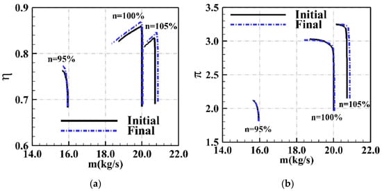 Figure 21 shows the aerodynamic performance of the initial case and final case at different rotations. The optimized counter-rotating compressor also has a wider stability margin, a higher total pressure ratio, and an adiabatic efficiency at off-design rotating speed, which prove the success of blade aerodynamic optimization and the advancement and practicability of the three-dimensional blade channel optimization platform in this paper.
