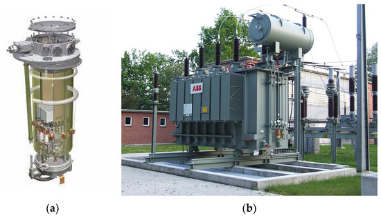 Figure 1. Electromechanical tap-changer for power transformer from ABB [www.abb.com, accesed on 1 April 2020] (a), view of power transformer from ABB [www.abb.com, accesed on 1 April 2020] (b).