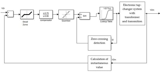 In article [11] is presented the construction of a transformer semiconductor tap-changer regulator. Figure 2 shows the structure of the proposed voltage regulator controlling the semiconductor tap changers. The first block introduces a deadband that prevents oscillations when a voltage error changed the value on the border of two adjacent taps. The electronic tap changer operates fast and real-time measurement of the RMS value of the regulation bus is expected. One of the best substitutions for the RMS value of the voltage is the instantaneous RMS value of the voltage. Compensating block is used instead of a delay block, which is a special type of compensator. In [26], it has been shown that the use of an integrator in the compensating block of an electronic tap-changer seems interesting from a quality point of view. The integrator produces typically the delay proportional to DB, and it also has memory. The integrator gain influences the stability and also the speed of the system. The tap changer control is not a continuous control. For this reason, a quantization block is required. A discrete value of the tap number will be assigned to the continuous value of the voltage error. Due to the fact that the tap switching should take place when a current close to zero flows through the winding. Then, there are no overvoltages and disturbances. The S&H block remembers the selected tap number and, after receiving the permission to switch from the zero-crossing current detection block, performs the tap change-over. The loop-up table for the selected tap number displays the states of semiconductor switches similar to Table 1.