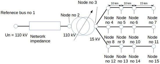 The tested network consists of a referencing node number one in the depths of the network, with the network impedance calculated on the basis of the short-circuit power on the HV busbars of the 110/15 kV substation (equivalent to the rest of the power system—Thevenin’s theorem). The structure of the network is presented in Figure 1 below. Nodes 4 to 15 are receiving nodes for which the value of active and reactive power is randomized, as in the actual network operation (the load powers of individual stations 15/0.4 change over time). The drawing of relative power values in individual load nodes was performed according to the following dependence (1) P,Q in p.u.: