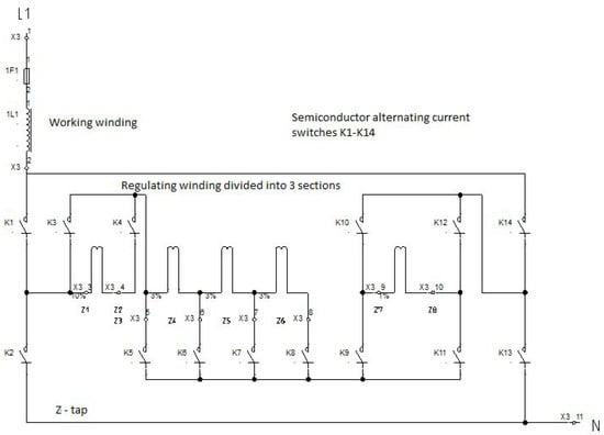The control winding was designed to be switched with semiconductor switches in such a way as to ensure smooth voltage regulation with a minimum number of taps and switches—Figure 4. Table 1 presents the switch states configuration depending on the required ratio.