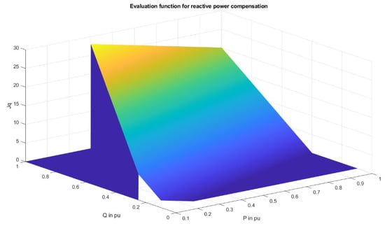 The reactive power compensation evaluation function should have a value of 0 when the reactive power does not exceed the value of 40% of active power. The evaluation function used is as follows (11):