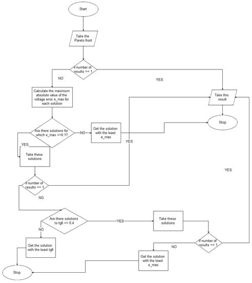 Multi-criteria optimization consists in determining the Pareto front for each input data. After determining the Pareto front, one solution should be chosen. The solution selection algorithm is shown in Figure 7.